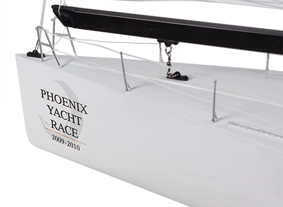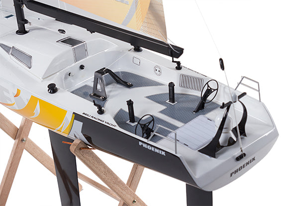 The Phoenix 870 sailboat comes plug and sail ready. Just install your own 2 channel surface radio, complete final assembly and go! Modeled after ocean going racing yachts, the Phoenix's hull is molded fibreglass composite with a perfect gelcoat and enamel painted finish. Supporting the colorfully printed rip-stop nylon main sail is a rugged aluminum main mast. All required items are installed, including mainsail winch, steering servo, rigging, sail and hardware. All you need to do is add your own 2CH or more radio system and battery! Protecting your expensive electronics is a O-ring sealed water resistant hatch. Dressing up the model are a few scale details like steering wheel and deck rails.