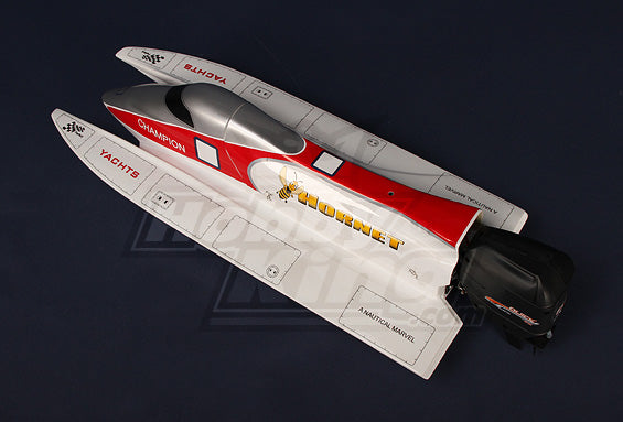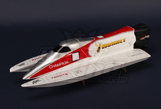 The large 1:10 scale Hornet Racing Boat has a stunning tunnelhull design and runs a large 540 outboard motor. Included is a waterproof ESC as well as a high speed servo for fast response. The 540 motor also controls the direction of the boat making it turn quickly without losing speed. The boat is constructed with fiberglass and immaculately painted and finished in a high-gloss gel-coat for improved glide and a glass finish!