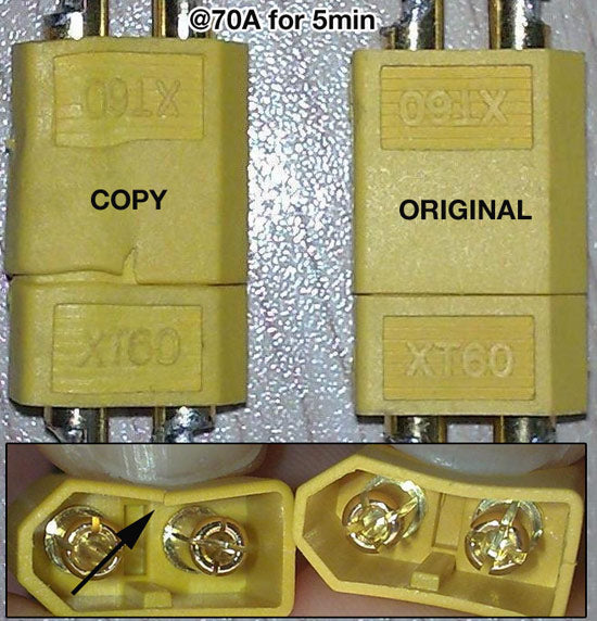 These are not cheap copied XT60 plugs. These original Nylon XT60 plugs can handle over 60A current for extended periods without exceeding 80DegC thanks to their better contact surface area. The plug is also less likely to deform or melt in comparison to copied non-Nylon XT60 plugs.
