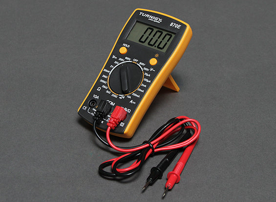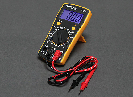 The Turnigy 870E is an invaluable tool to keep in your flight box. From checking battery voltage, to measuring current, checking continuity of your wiring connections and more, this digital multimeter is just the tool for the job! Its large backlit LCD display and built-in stand make it easy to read in any lighting condition.