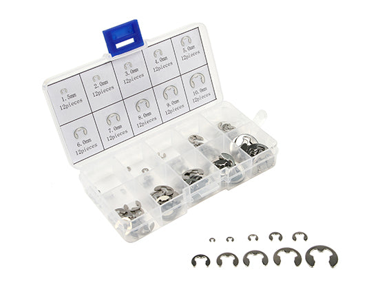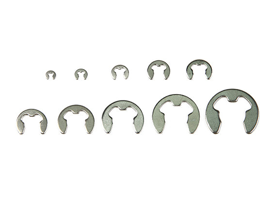 An excellent selection of E-Clips, from 1.5mm to 10mm, in a handy plastic container.