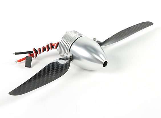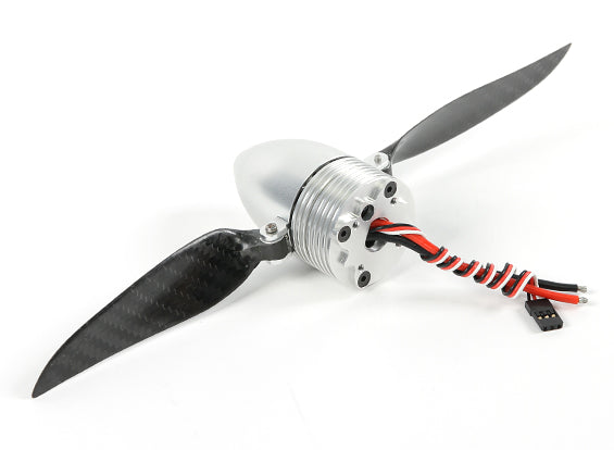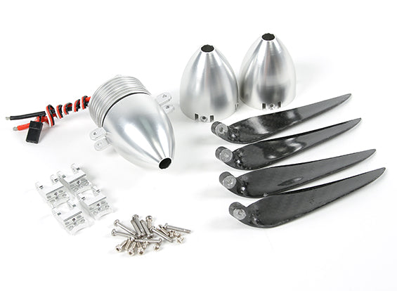 The ultimate in clean power system installations for electric gliders, the FPS10 Power System is perfect for use in 1.2~1.8M electric gliders. The FPS10 features a brushless electric motor with an integrated 30 amp ESC, plus an aluminum spinner set that can be adapted for 2, 3, and 4 blade setups. We even include four 9.5x5 carbon fiber propeller blades in the box!