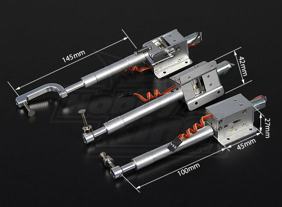 Full Metal Servoless Retract with 100mm Oleo Legs (Tricycle - 90 degree) 1.20 class - High quality servoless retract system for large models, features all metal construction for precision, reliability and durability, also features auto cut off for protection against excessive current draw.......finally, a reliable alternative to air & mechanical operated retract systems on larger models!