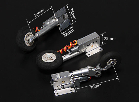 Full Metal Servoless Retracts with Steerable Nose Assembly and Oleo Legs - High quality servoless retract system for models weighing up to 3kg, features all metal construction for precision, reliability and durability, also features auto cut off for protection against excessive current draw. Included are a set of quality Oleo legs and plastic wheels with foam tires. Finally, a reliable alternative to air & mechanical operated retract systems for your models!