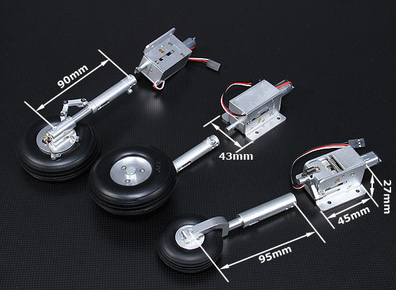 Full Metal Servoless Retract with Oleo Legs (Tricycle - 90 degree) 1.20~1.60 size Models/90mm~120mm Class Jets - servoless retract system specifically designed for large scale jet's and tricycle prop driven models. The retracts feature an all metal construction for precision, reliability and durability as well as auto cut off for protection against excessive current draw.