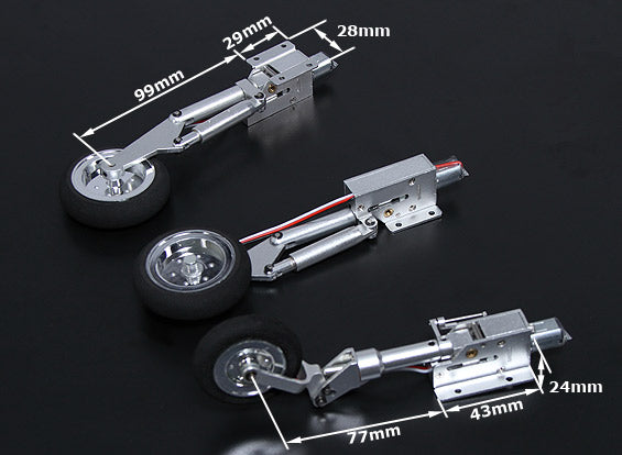 Full Metal Servoless Retract with Oleo Legs (Tricycle, Mig 17 type) 90~1.20 class - High quality servoless retract system for large models, features all metal construction for precision, reliability and durability, also features auto cut off for protection against excessive current draw. Also included are a set of quality Oleo legs and plastic wheels with rubber tyres. Steerable nose wheel.........Finally, a reliable alternative to air & mechanical operated retract systems on larger models!
