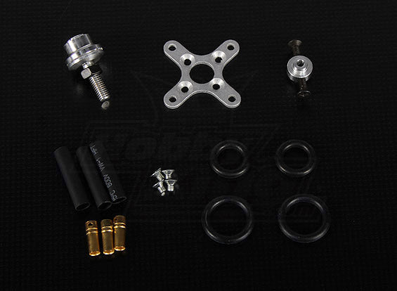 All Scorpion 22mm motors come with 3.5mm male Bullet style connectors already attached, and include a complete hardware package that contains the following: 3 matching female Bullet connectors for your speed controller, a cross style back plate mount with 4 screws, and a threaded shaft prop adapter.