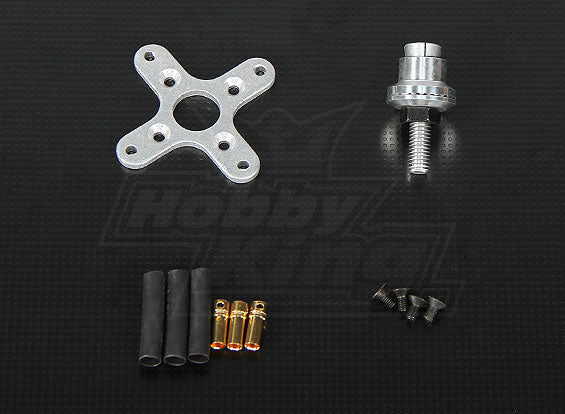 All Scorpion SII-30mm motors come with Scorpion's new 2.5mm male Bullet style connectors already attached, and include a complete hardware package that contains the following: 3 matching female Bullet connectors for your speed controller, a cross style backplate mount with 4 screws, and a threaded shaft prop adapter.