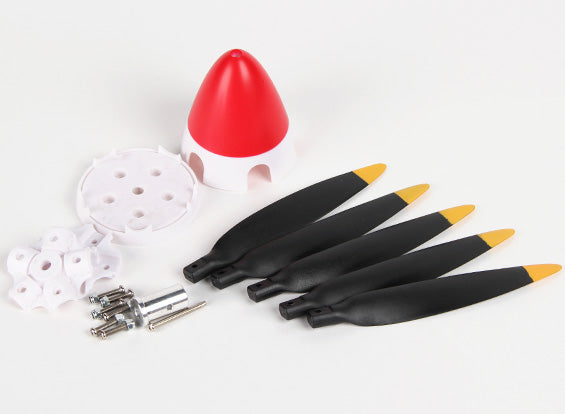 The set includes the painted 5-blade spinner, 5 individual blades, prop hub with metal parts and a specifically designed prop nut that secures the whole assembly including the spinner to the motor shaft. The set has been designed around the Durafly 5 blade 3648 550kv Spitfire motor made specifically for this application that will need to be purchased separately. A 45-55amp esc is also required.